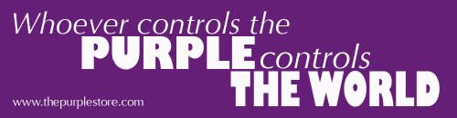 Purple background bumper sticker with white text: "Whoever controls the purple, controls the world."So true. Once upon a time, only royalty could afford purple. Before synthetic purple dyes were invented, it took 8,500 murex shellfish to make a single gram of purple dye.This slogan is also offered on Amazon as a t-shirt (please try entering B000VUK6J4 in the search box).